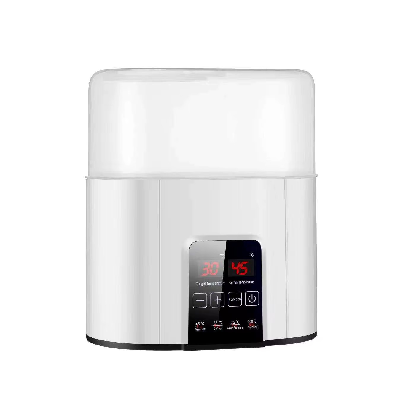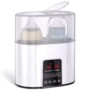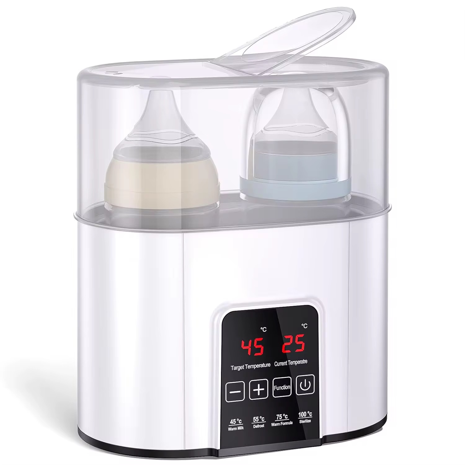 Digital baby bottle warmer with 4 heat modes, sterilization function, LED display, dual-bottle capacity and constant temperature control.