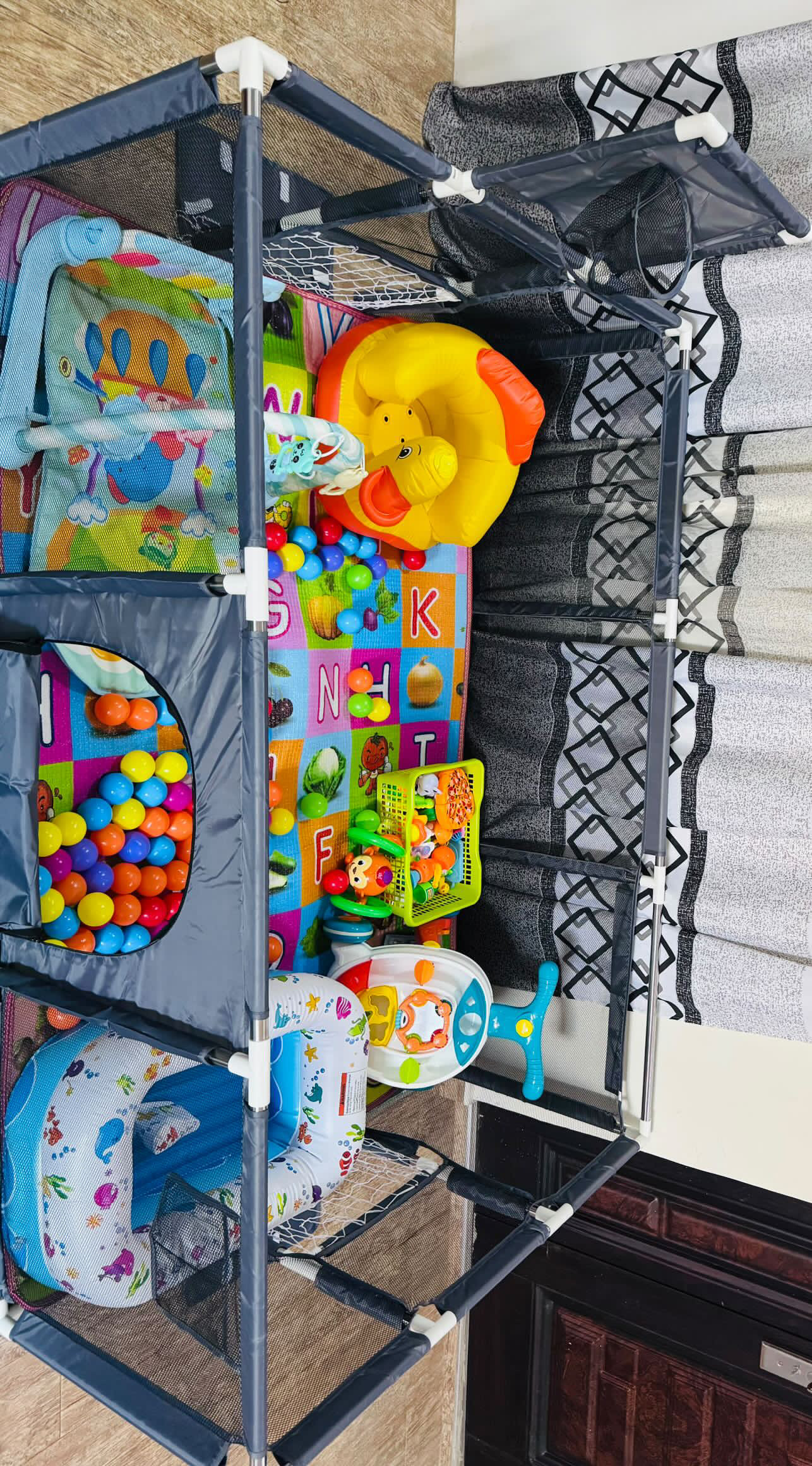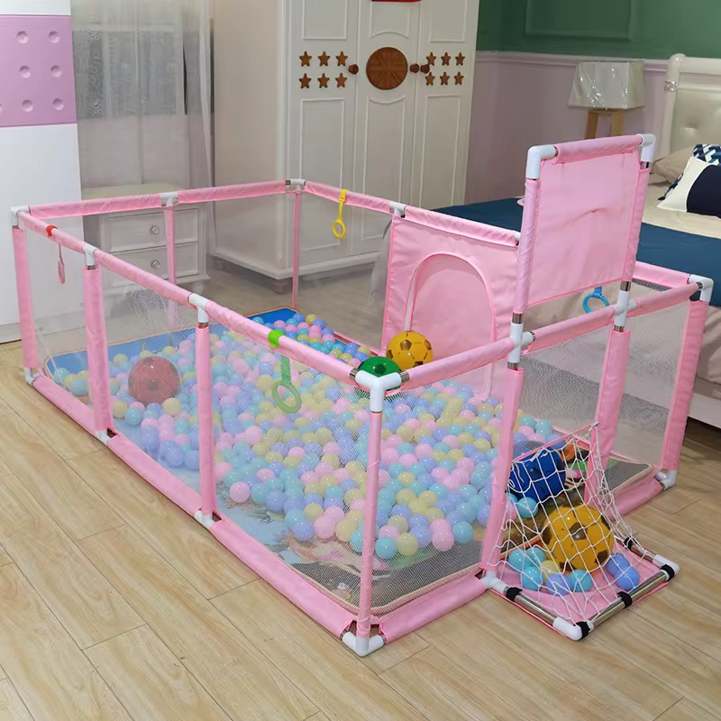 Durable Baby Playpen with mesh walls, steel frame and colorful ball pit for safe play.