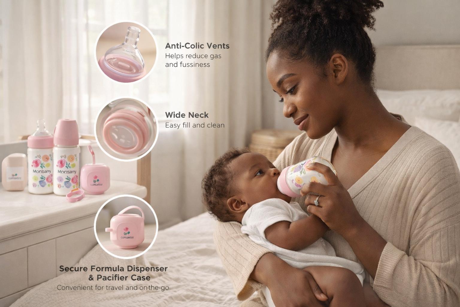 BPA-free floral baby bottle set with anti-colic nipples, ergonomic design, wide-neck opening, formula container, and pacifier holder for safe, comfortable feeding.