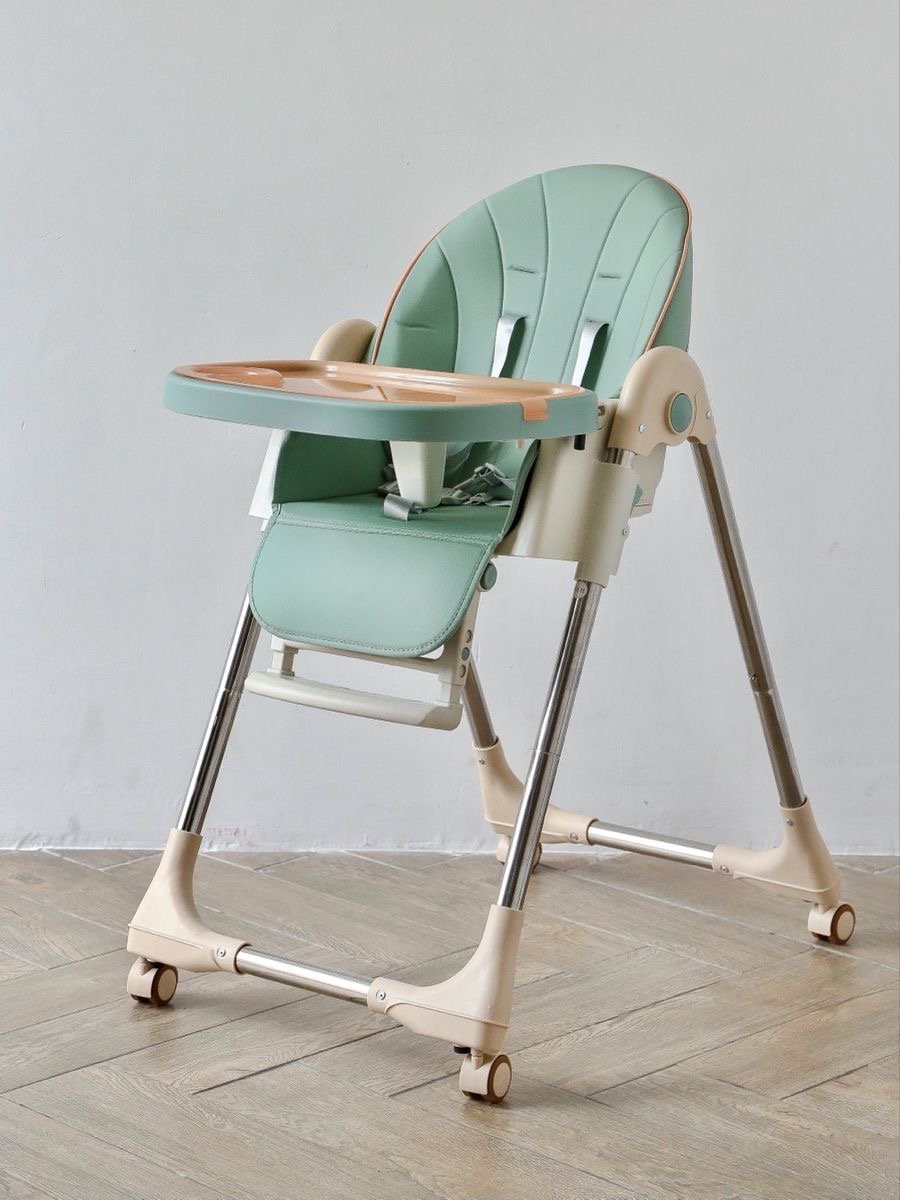 Adjustable cushioned baby feeding chair with safety straps and feeding tray.